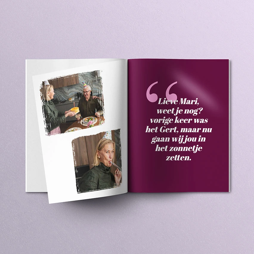 In slechts enkele stappen kan jij eenvoudig het meest unieke verjaardagscadeau samenstellen. In onze editor creëer jij jouw eigen glossy vol met mooie en grappige herinneringen, lieve opmerkingen en foto’s voor de jarige. Hij of zij verdient het om in het zonnetje gezet te worden! Dankzij jou zal de jarige zijn of haar verjaardag nooit vergeten!