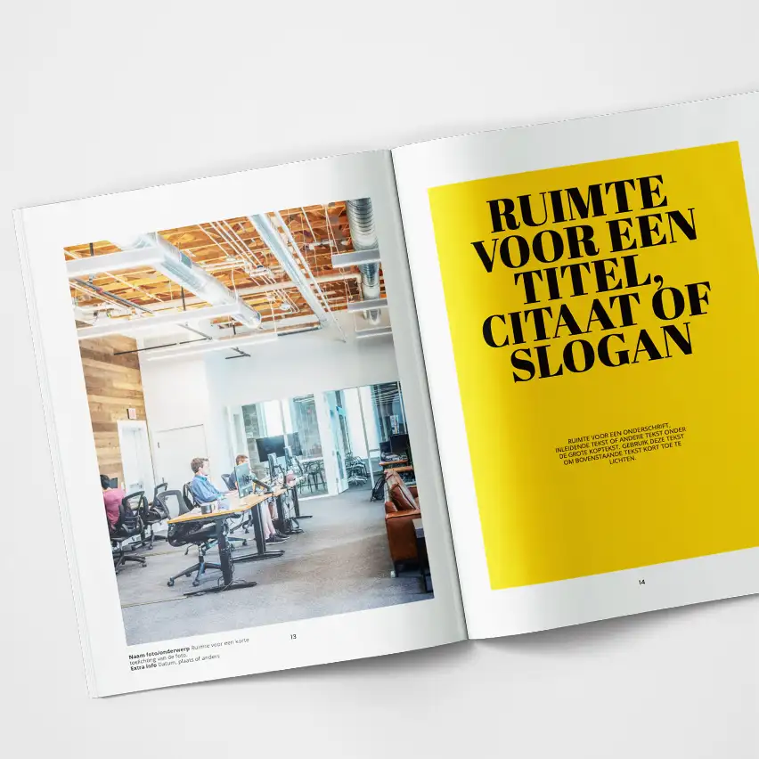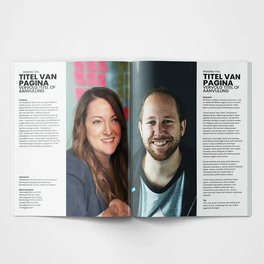 In dit personeelsmagazine template zijn de pagina’s met zorg vormgegeven. U hoeft u alleen uw teksten en foto’s te plaatsen in de tekst- en fotoblokken. U vindt veel verschillende soorten pagina’s die u helemaal kunt aanpassen naar uw wensen. U kiest er ook zelf voor welke pagina’s u gebruikt door pagina’s te dupliceren of te verwijderen.